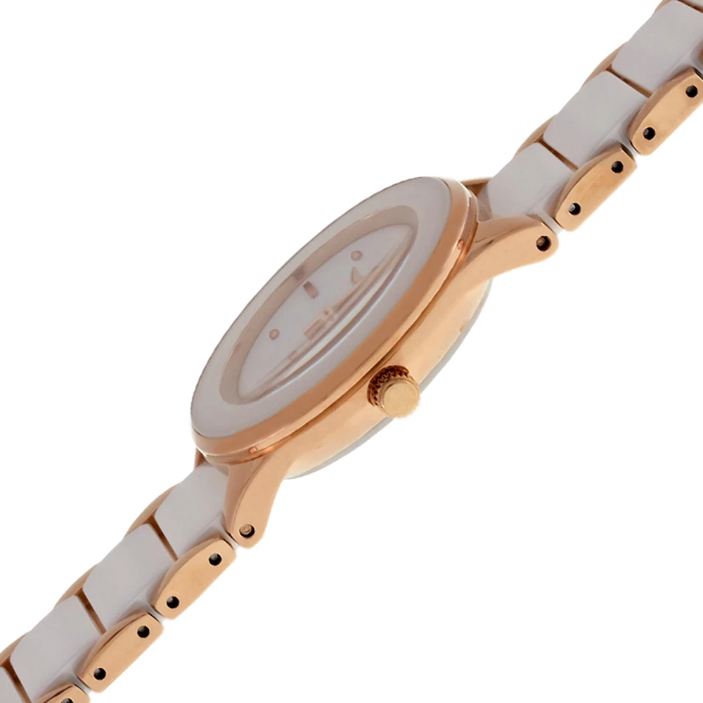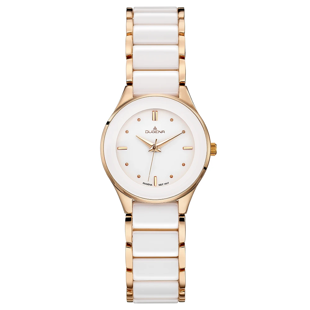 Dámske hodinky od Nemeckého výrobcu DUGENA. Hodinky sú kombinácie ušľachtilej ocele a keramiky. Hodinky sú vybavené hodinovou, minútovou a sekundovou ručičkou. Luneta je z bielej keramiky, biely ciferník s indexmi. Puzdro hodiniek sa zafírovým sklíčkom má priemer 29mm. Prevádzka hodiniek zaisťuje spoľahlivý batériový strojček. Zlaté časti hodiniek sú pozlátené ružovým zlatom technológií PVD. Hodinky sú dodávané v originálnej krabičke s logom DUGENA. Tieto dámske hodinky sú vodeodolné na úrovni 3 ATM.