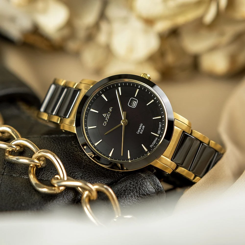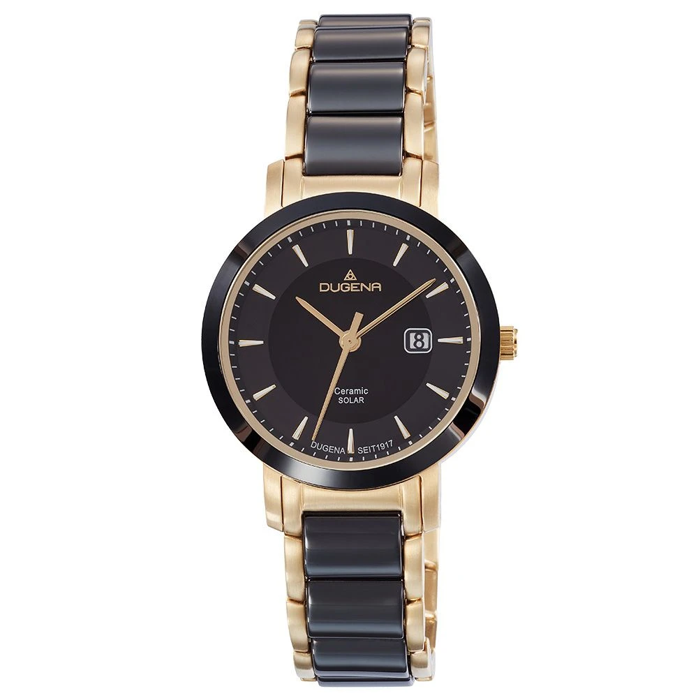 Dámske hodinky od Nemeckého výrobcu Dugena. Hodinky sú kombinácia ušľachtilej ocele a keramiky. Hodinky sú vybavené ukazovateľom dátumu, hodinovou, minútovou a sekundovou rúčkou. Čierny ciferník s indexmi. Puzdro hodiniek má priemer 30mm. Povrch oceľových častí puzdra a náramku je pozlátený technológiou PVD. Prevádzka hodiniek zaisťuje spoľahlivý strojček na solárny pohon. Hodinky sú dodávané v originálnej krabičke s logom Dugena. Tieto dámske hodinky sú vodeodolné na úrovni 5 ATM.