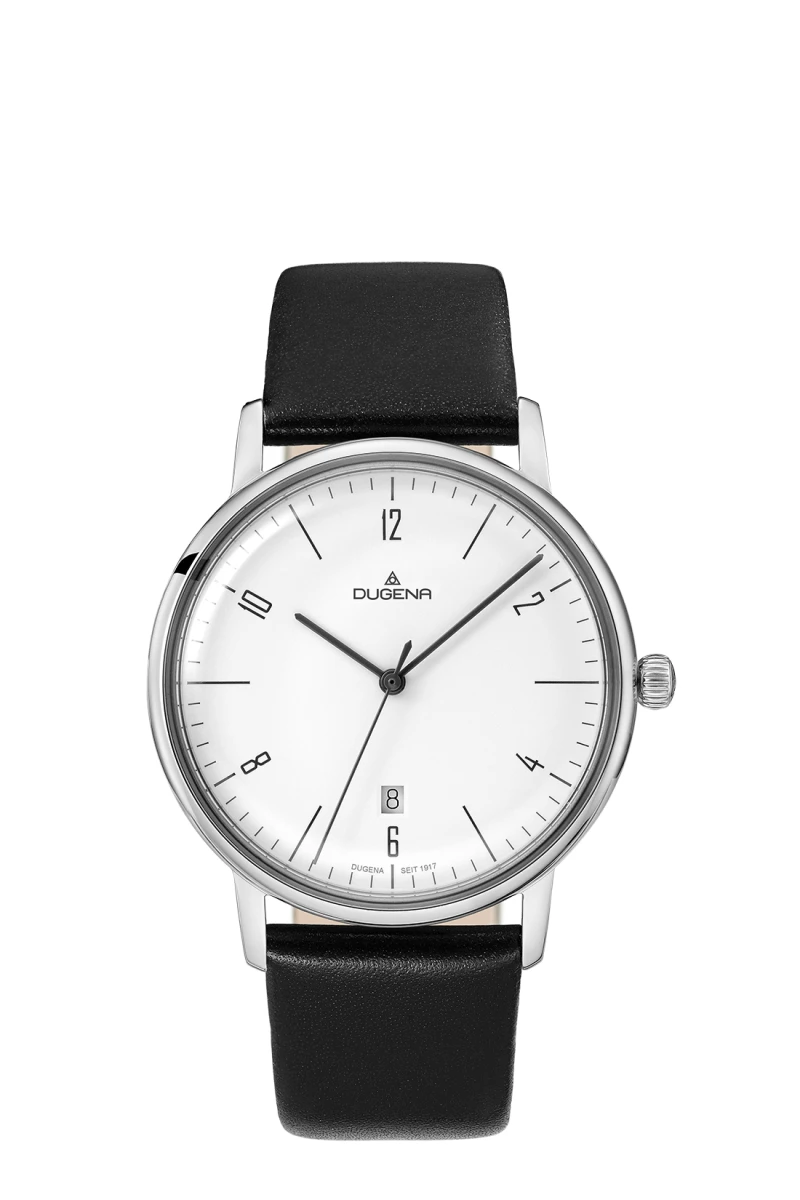 Moderné dámske hodinky Dugena s koženým remienkom. Hodinky sú vyrobené z chirurgickej ocele, sklíčko hodiniek je minerálne. Ciferník je bieli s čiernymi arabskými číslicami a indexy. Hodinky sú vybavené ukazovateľom dátumu, hodinovou, minútovou a sekundovou ručičkou. Rozmer púzdra 38,5x9mm. Chod hodiniek zaisťuje spoľahlivý batériový strojček. Hodinky sú vodotesné na úrovni 3 ATM. Na všetky dámske hodinky DUGENA platí záruka v dĺžke 36 mesiacov. Hodinky sú dodávané v darčekovej krabičke s logom.