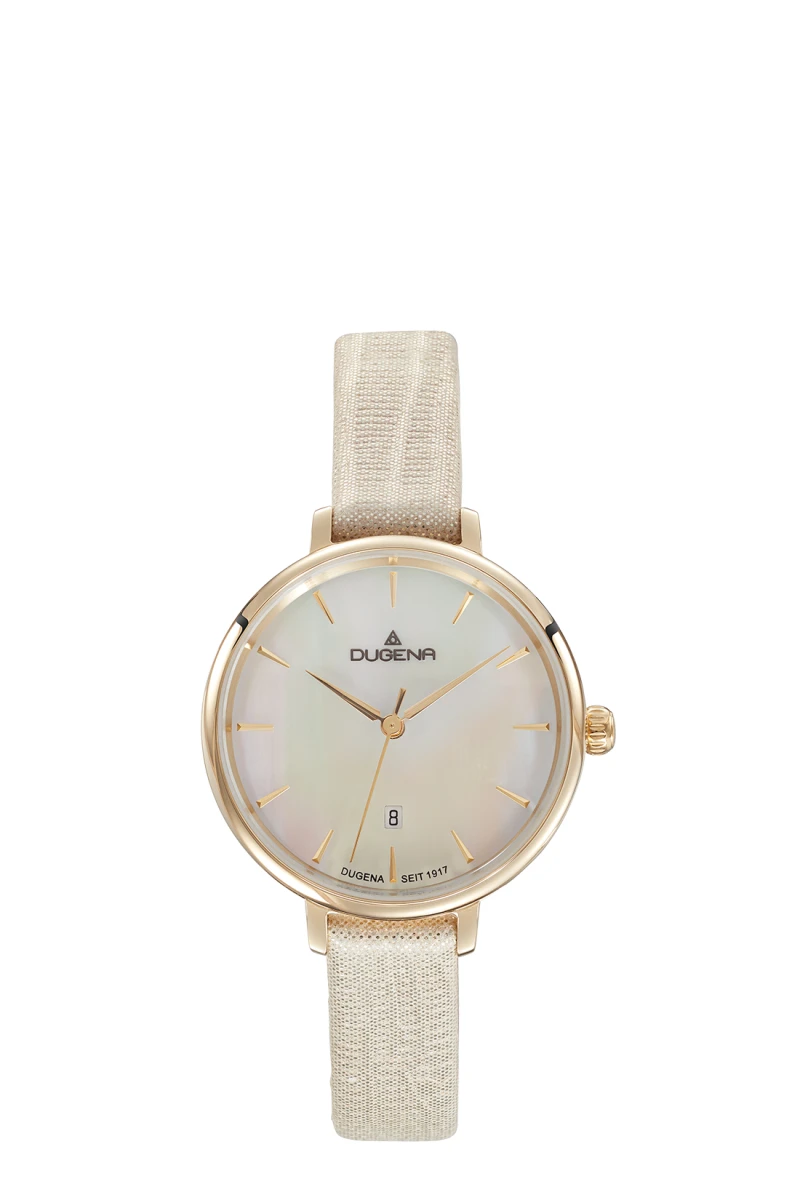 Dámske hodinky na ruku Dugena s koženým remienkom. Hodinky sú vyrobené z chirurgickej ocele, sklíčko hodiniek je minerálne. Okrúhly ciferník s perleťovým efektom zlatými indexy. Hodinky sú vybavené ukazovateľom dátumu, hodinovou, minútovou a sekundovou ručičkou. Puzdro hodiniek je pozlátené žltým zlatom technológií IP. Priemer púzdra hodiniek 30 mm. Chod hodiniek zaisťuje spoľahlivý batériový strojček. Hodinky sú vodotesné na úrovni 3 ATM. Na všetky dámske hodinky Dugena platí záruka v dĺžke 36 mesiacov. Hodinky sú dodávané v darčekovej krabičke s logom.