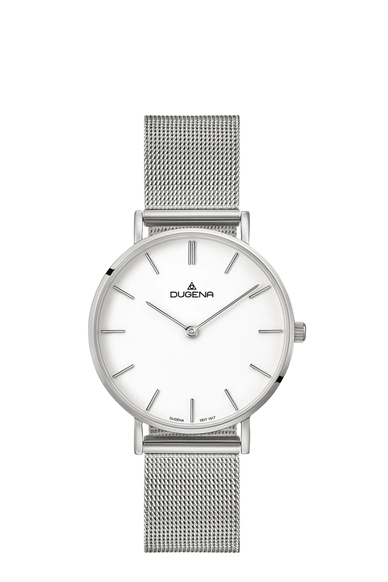 Dámske náramové hodinky DUGENA z chirurgickej ocele, sklíčko hodiniek je minerálne. Okrúhly biely ciferník s indexmi. Hodinky sú vybavené hodinovou a minútovou ručičkou. Rozmer púzdra 33,5x7 mm. Chod hodiniek zaisťuje spoľahlivý batériový strojček. Hodinky sú vodotesné na úrovni 3 ATM. Na všetky dámske hodinky Dugena platí záruka v dĺžke 36 mesiacov. Hodinky sú dodávané v darčekovej krabičke s logom.