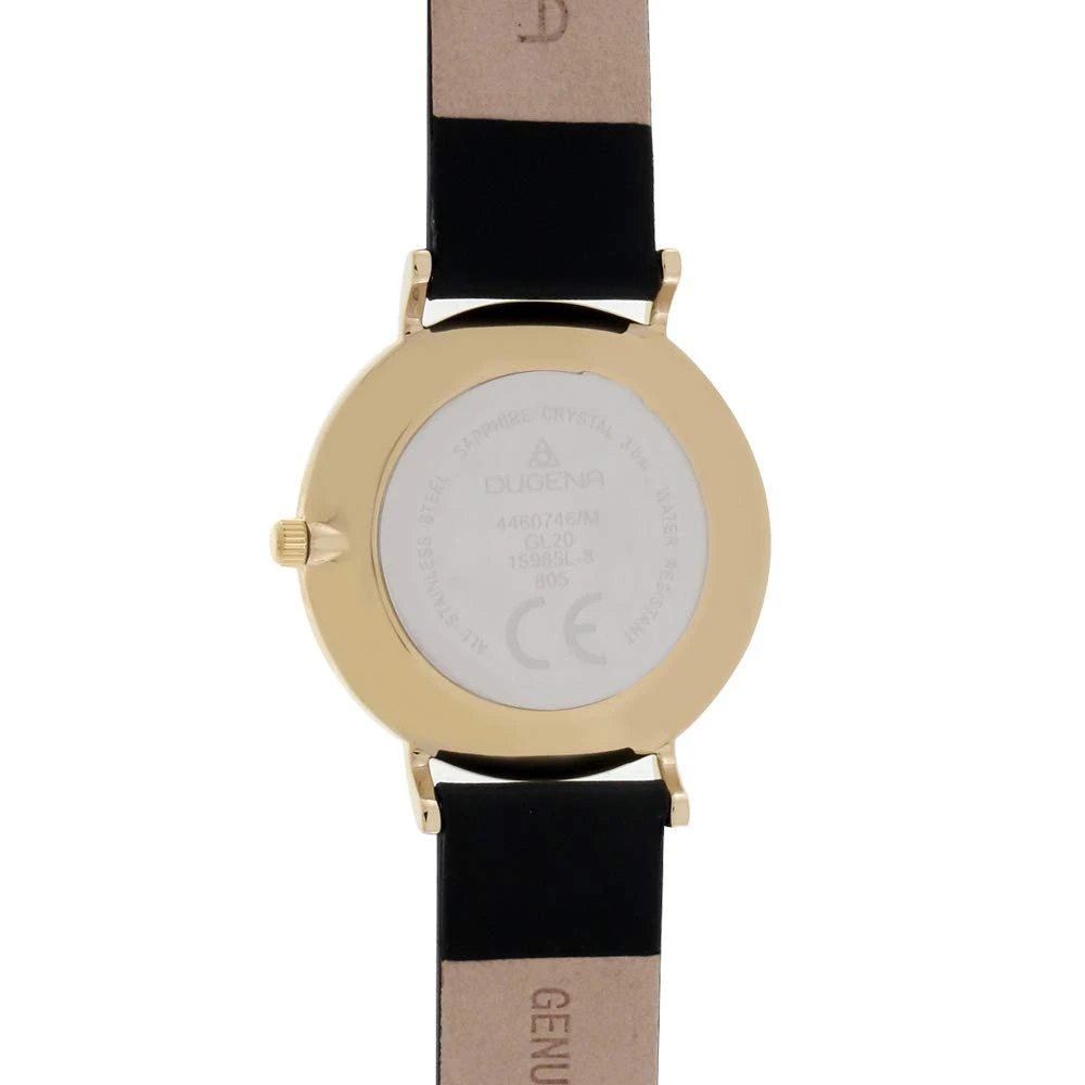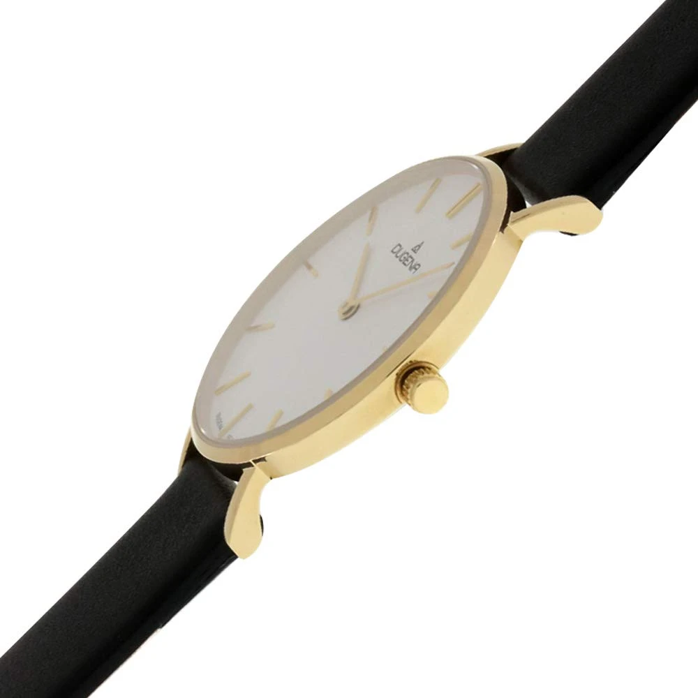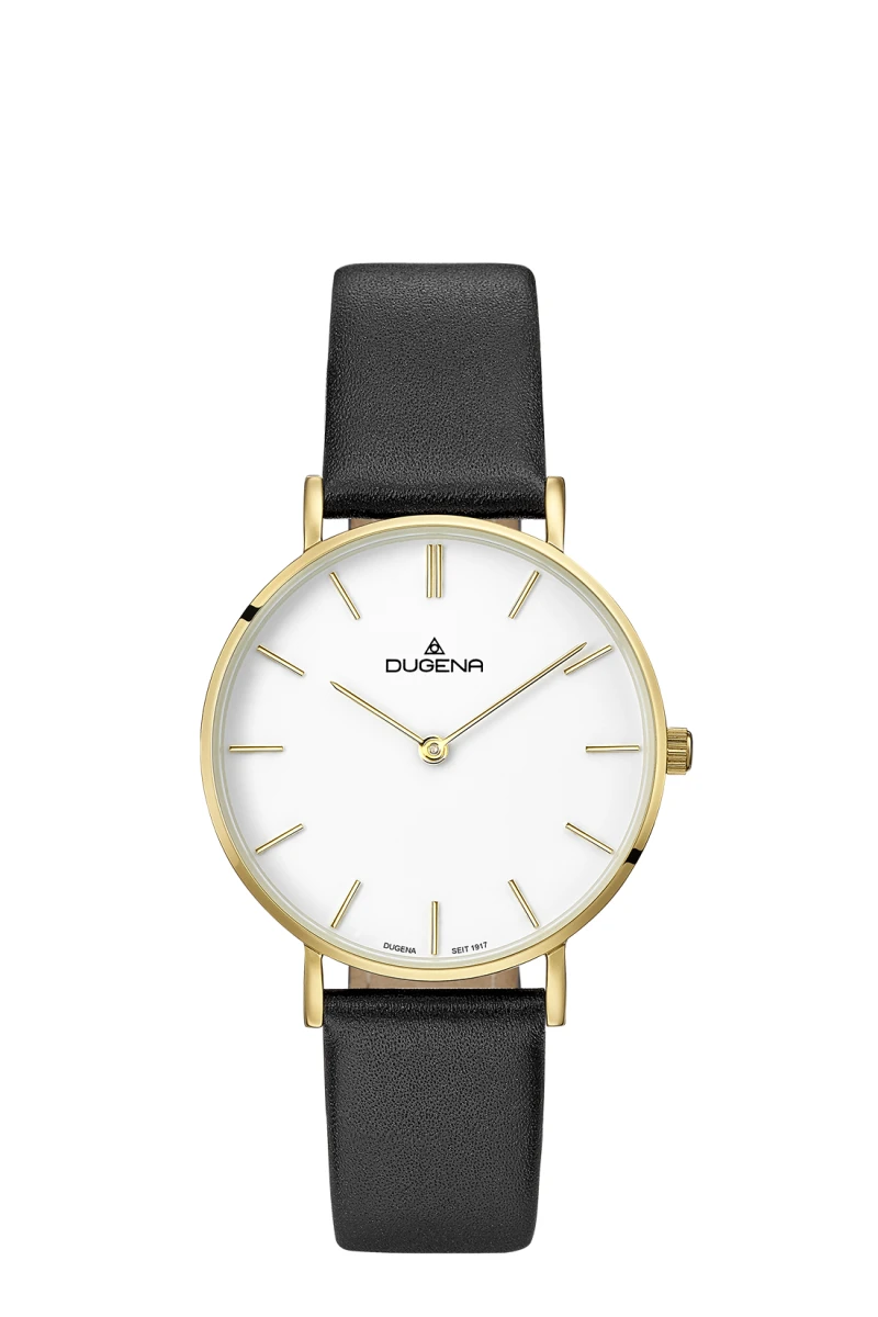 Moderné dámske hodinky Dugena s koženým remienkom. Puzdro hodiniek je vyrobené z chirurgickej ocele, sklíčko hodiniek je minerálne. Okrúhly biely ciferník s indexmi. Hodinky sú vybavené hodinovou a minútovou ručičkou. Rozmer púzdra 33,5x7 mm. Povrch púzdra hodiniek je pozlátený žltým zlatom technológií PVD. Chod hodiniek zaisťuje spoľahlivý batériový strojček. Hodinky sú vodotesné na úrovni 3 ATM. Na všetky dámske hodinky Dugena platí záruka v dĺžke 36 mesiacov. Hodinky sú dodávané v darčekovej krabičke s logom.