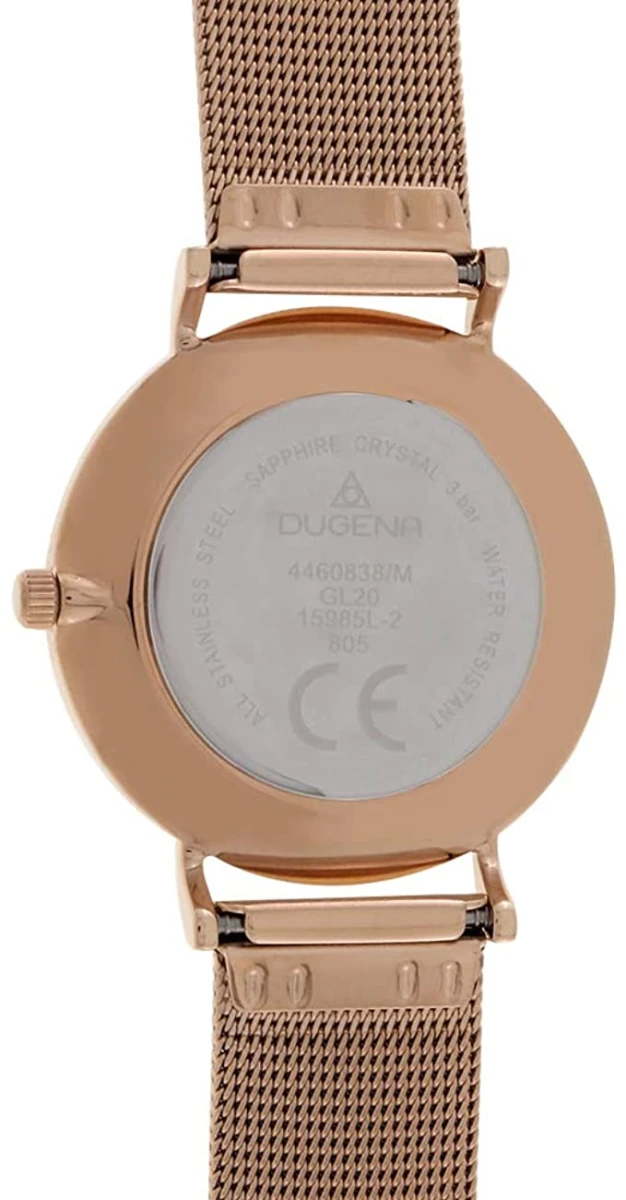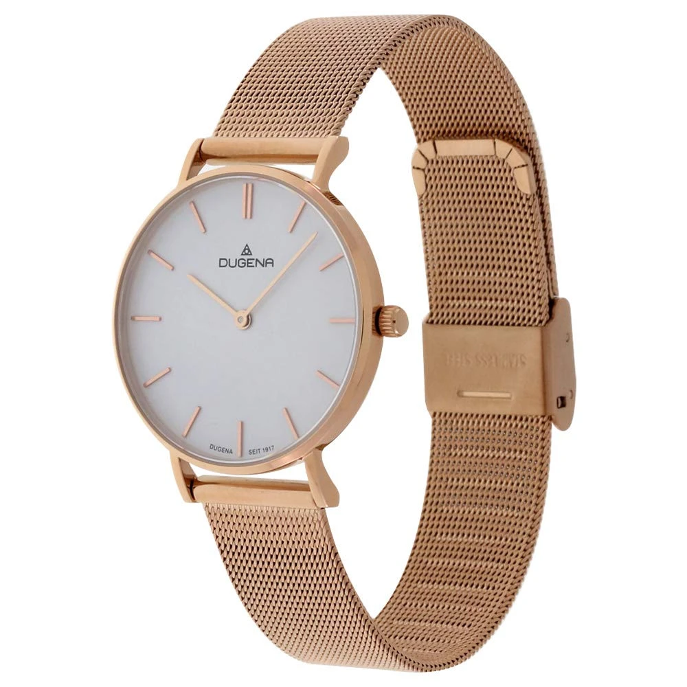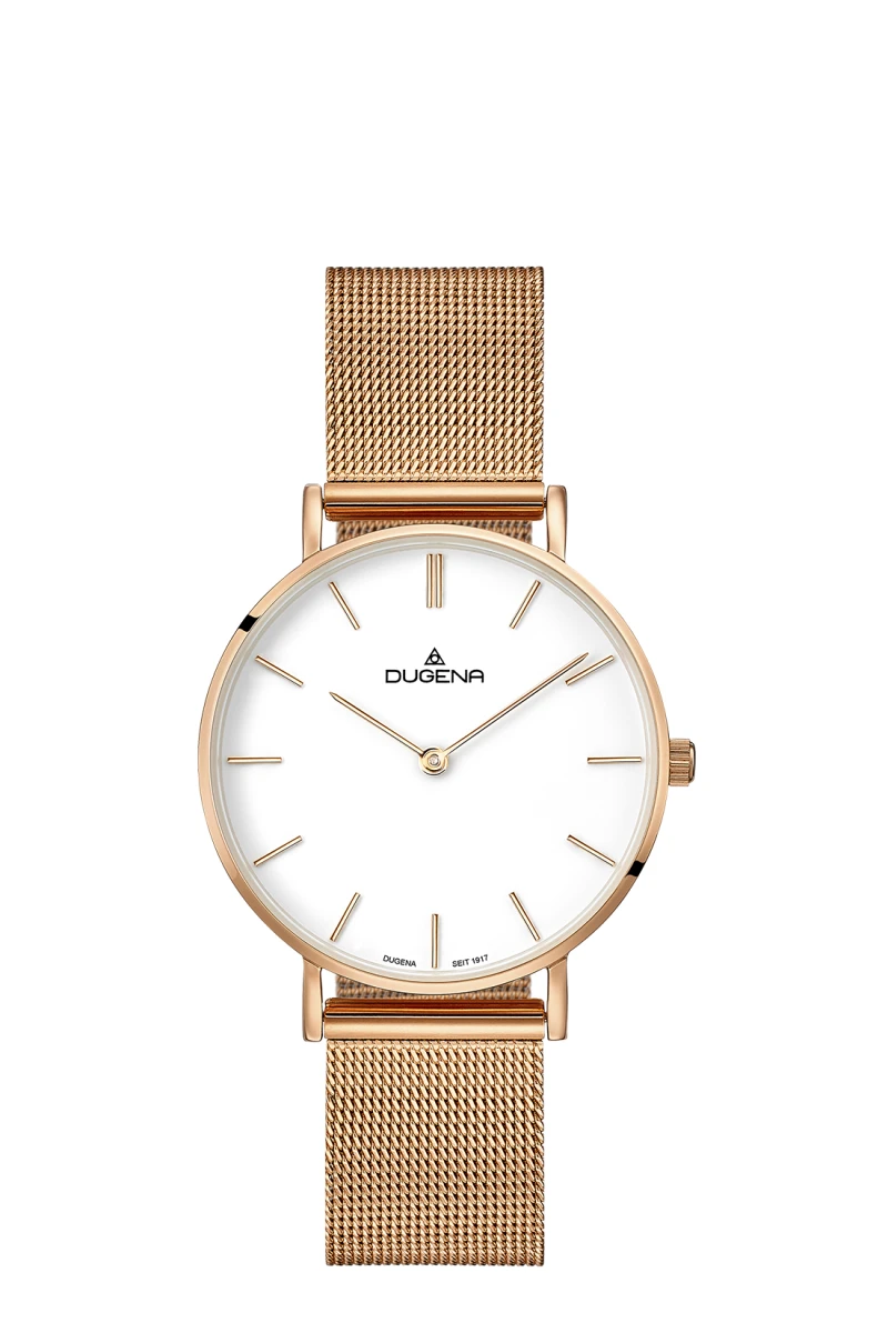 Dámske náramové hodinky DUGENA z chirurgickej ocele, sklíčko hodiniek je minerálne. Okrúhly biely ciferník s indexmi. Hodinky sú vybavené hodinovou a minútovou ručičkou. Rozmer púzdra 33,5x7 mm. Chod hodiniek zaisťuje spoľahlivý batériový strojček. Hodinky sú vodotesné na úrovni 3 ATM. Povrch hodiniek je pozlátený ružovým zlatom technológií PVD. Na všetky dámske hodinky Dugena platí záruka v dĺžke 36 mesiacov. Hodinky sú dodávané v darčekovej krabičke s logom.