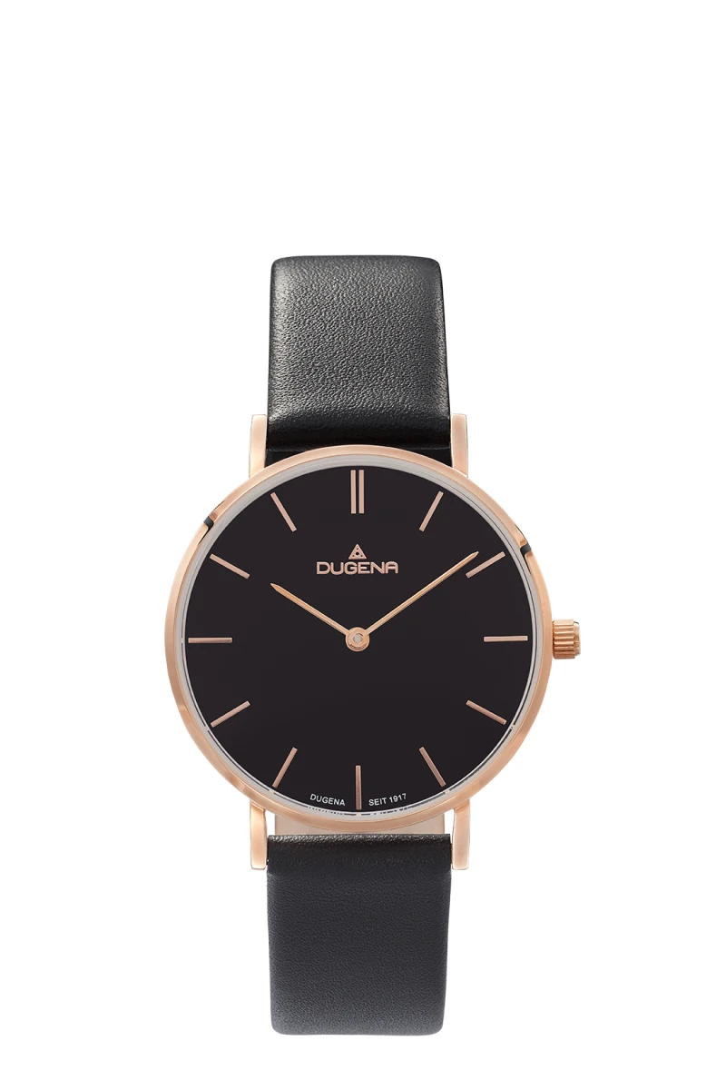 Moderné dámske hodinky Dugena s koženým remienkom. Hodinky majú puzdro vyrobené z chirurgickej ocele, sklíčko hodiniek je minerálne. Okrúhly čierny ciferník s indexmi. Hodinky sú vybavené hodinovou a minútovou ručičkou. Rozmer púzdra 33,5x7 mm. Puzdro hodiniek má povrch pozlátený ružovým zlatom technológií PVD. Chod hodiniek zaisťuje spoľahlivý batériový strojček. Hodinky sú vodotesné na úrovni 3 ATM. Na všetky dámske hodinky Dugena platí záruka v dĺžke 36 mesiacov. Hodinky sú dodávané v darčekovej krabičke s logom.