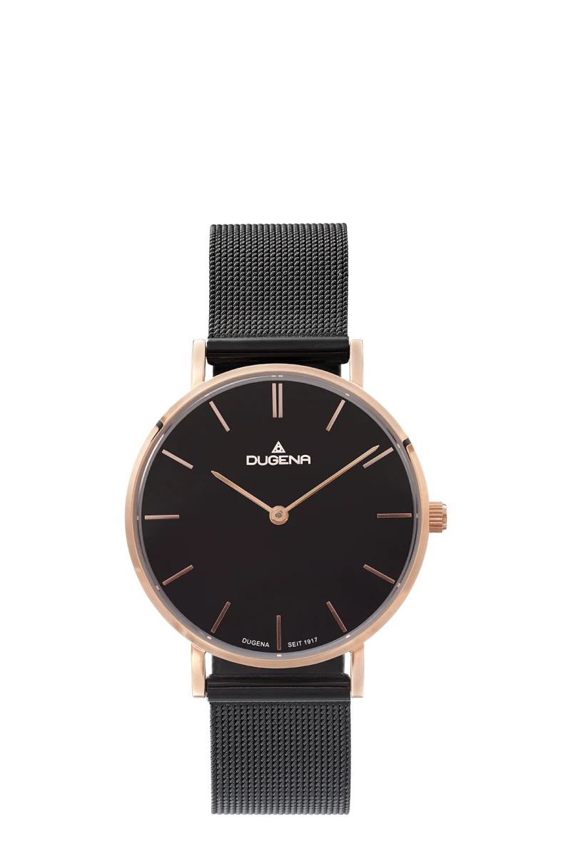 Hodinky dámske Dugena s čiernym náramkom vyrobené z chirurgickej ocele, sklíčko hodiniek je minerálne. Okrúhly čierny ciferník s indexmi. Hodinky sú vybavené hodinovou a minútovou ručičkou. Rozmer púzdra 33,5x7 mm. Chod hodiniek zaisťuje spoľahlivý batériový strojček. Povrch púzdra hodiniek je pozlátený ružovým zlatom technológií PVD. Hodinky sú vodotesné na úrovni 3 ATM. Na všetky dámske hodinky Dugena platí záruka v dĺžke 36 mesiacov. Hodinky sú dodávané v darčekovej krabičke s logom.