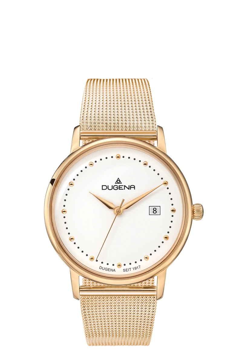 Dámske náramové hodinky Dugena z chirurgickej ocele s milánskym ťahom, sklíčko hodiniek je minerálne. Okrúhly biely ciferník s indexmi. Hodinky sú vybavené dátumovkou, hodinovou, minútovou a sekundovou ručičkou. Veľkosť púzdra 38,5 x 9,5 mm. Povrch hodiniek je pozlátený ružovým zlatom technológií PVD. Chod hodiniek zaisťuje spoľahlivý batériový strojček. Hodinky sú vodotesné na úrovni 3 ATM. Na všetky dámske hodinky Dugena platí záruka v dĺžke 36 mesiacov. Hodinky sú dodávané v darčekovej krabičke s logom.