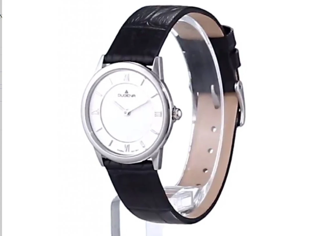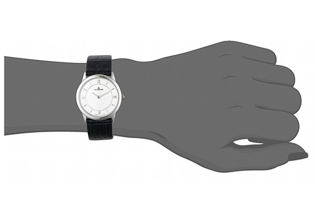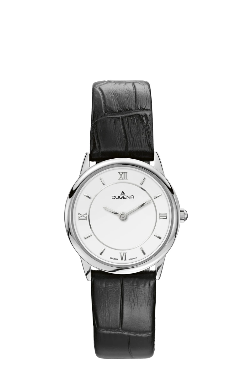 Dámske náramkové hodinky Dugena z chirurgickej ocele s koženým remienkom so zapínaním na jednoduchú pracku, sklíčko hodiniek je minerálne. Okrúhly biely ciferník s rímskymi číslami a indexy. Hodinky sú vybavené hodinovou a minútovou rúčkou. Veľkosť púzdra 29x7,5 mm. Chod hodiniek zaisťuje spoľahlivý batériový strojček. Hodinky sú vodotesné na úrovni 3 ATM. Na všetky dámske hodinky Dugena platí záruka v dĺžke 36 mesiacov. Hodinky sú dodávané v darčekovej krabičke s logom.