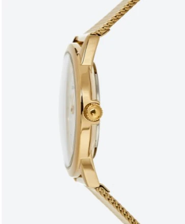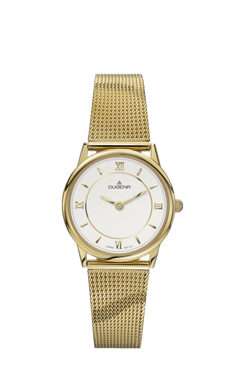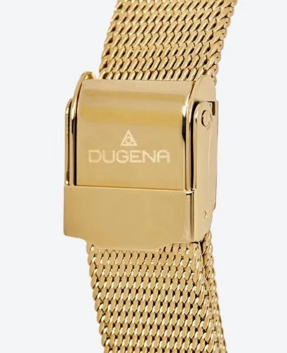 Dámske náramkové hodinky Dugena z chirurgickej ocele s milánskym ťahom so zapínaním na posuvnú pracku, sklíčko hodiniek je minerálne. Okrúhly biely ciferník s rímskymi číslami a indexy. Hodinky sú vybavené hodinovou a minútovou rúčkou. Veľkosť púzdra 29x7,5 mm. Povrch hodinky je upravený žltým zlatom technológií PVD. Chod hodiniek zaisťuje spoľahlivý batériový strojček. Hodinky sú vodotesné na úrovni 3 ATM. Na všetky dámske hodinky Dugena platí záruka v dĺžke 36 mesiacov. Hodinky sú dodávané v darčekovej krabičke s logom.