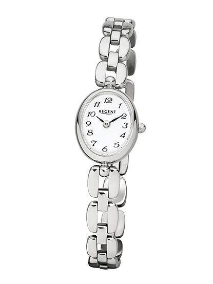 Dámske hodinky od Nemeckého výrobcu Regent. Hodinky sú vyrobené z chirurgickej ocele. Hodinky sú vybavené hodinovou a minútovou rúčkou, ktoré zobrazujú čas na bielom ciferníku s čiernym číselníkom. Puzdro hodiniek má rozmer 22x17 mm, výška púzdra 7 mm. Náramok so zapínaním na jednoduchú sponu je široký 9 mm. Prevádzka hodiniek zaisťuje spoľahlivý batériový strojček. Hodinky sú dodávané v originálnej krabičke s logom Regent. Tieto dámske hodinky sú vodeodolné na úrovni 3 ATM.