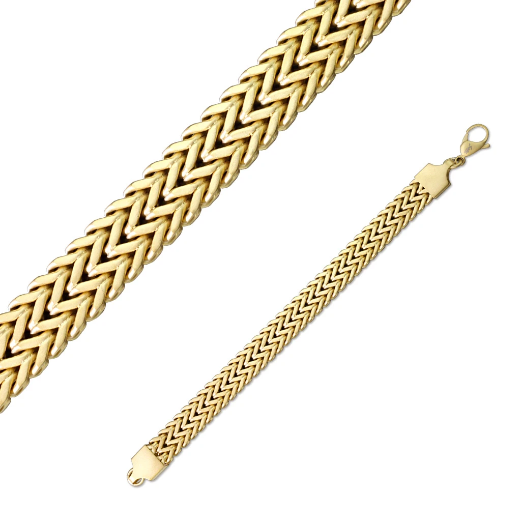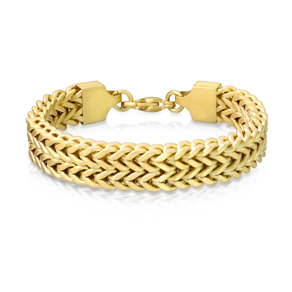 Dámsky náramok na ruku z chirurgickej ocele. Povrch náramku je matný pozlátený technológiou PVD. Krásny dvojradový náramok pre ženy široký 8mm. Zapínanie náramku je karabínové.