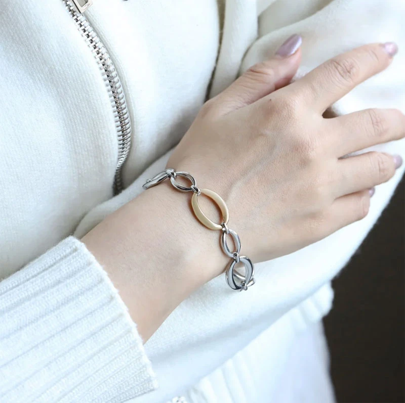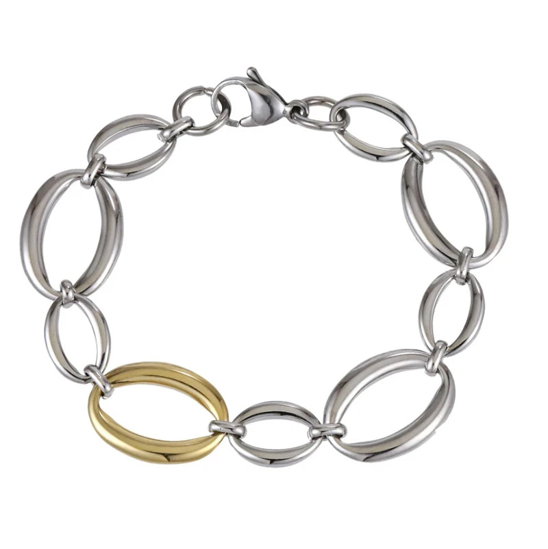 Dámsky náramok z chirurgickej ocele s lešteným povrchom. Povrch jedného článku je pozlátený žltým 14K zlatom. Väčšie články náramku sú široké 15mm, menšie články sú široké 10mm, náramok je dlhý 19cm. Zapínanie náramku je karabínové. Elegantný nadčasový náramok, ktorý vďaka kvalitnej chirurgickej oceli vydrží dlhú dobu.