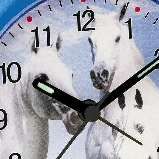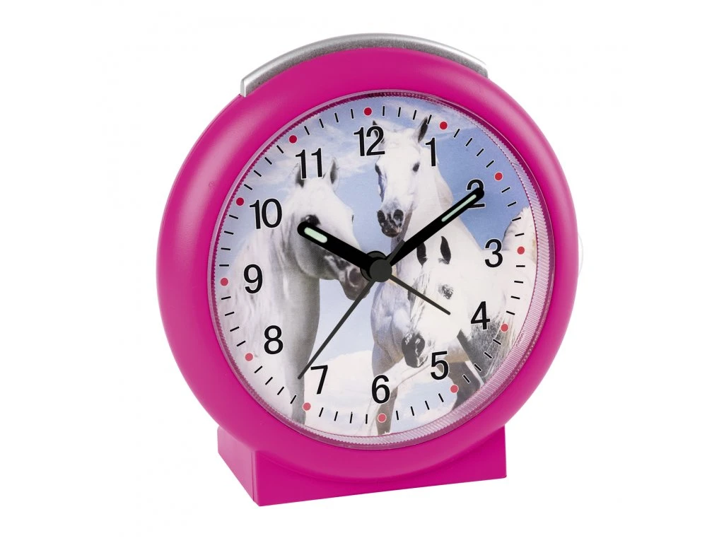 Detský budík pre malých milovníkov koní. Budík má hodinovú, minútovú a sekundovú rúčku. Stlačením strieborného tlačidla na vrchu budíka dôjde k osvetleniu ciferníka. Budík má funkciu alarmu. Spustený alarm pípa. Priemer ciferníka 85 mm. Výška budíka 112 mm, šírka 105 mm, hĺbka 44 mm. Pohon budíka je batériový na 1 batériu typu AA. Batéria je súčasťou balenia.