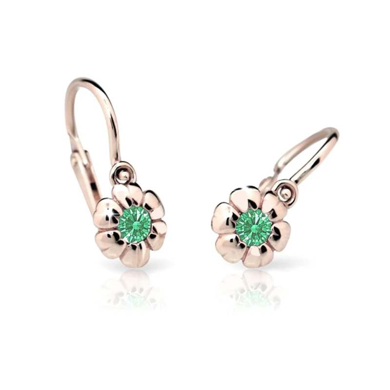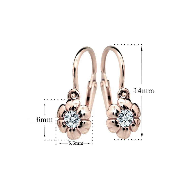 Detské náušnice z ružového zlata rýdzosti 585/000. Povrch náušníc je leštený. Náušnice s ozdobou kvetu. V strede kvetu je kamienok. Rozmery náušničiek nájdete zobrazené na podpornej fotografii. Náušnice majú bezpečnostné zapínanie na detskú brizúru. Krásne zlaté detské náušnice od českého výrobcu CUTIE JEWELLERY. Uvedená cena za 1 pár.