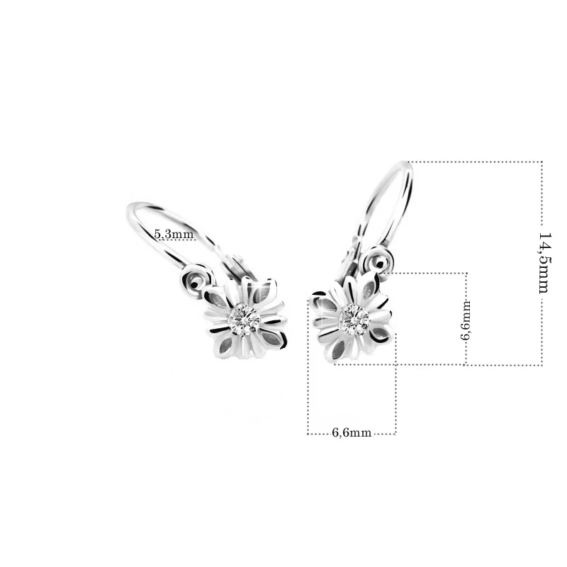 Detské náušnice vyrobené z bieleho zlata 585/1000. Náušnice sú navrhnuté a vyrobené s ohľadom na komfortné a bezpečné užívanie pre bábätká od najútlejšieho veku. Zapínanie náušničiek na detskú brizuru zamedzuje ich ľahkému otvoreniu a následnej strate detské náušničky. Ozdoba so zirkónom má rozmer 6,6 × 6,6 mm, celková "výška" náušničky 14,5 mm.