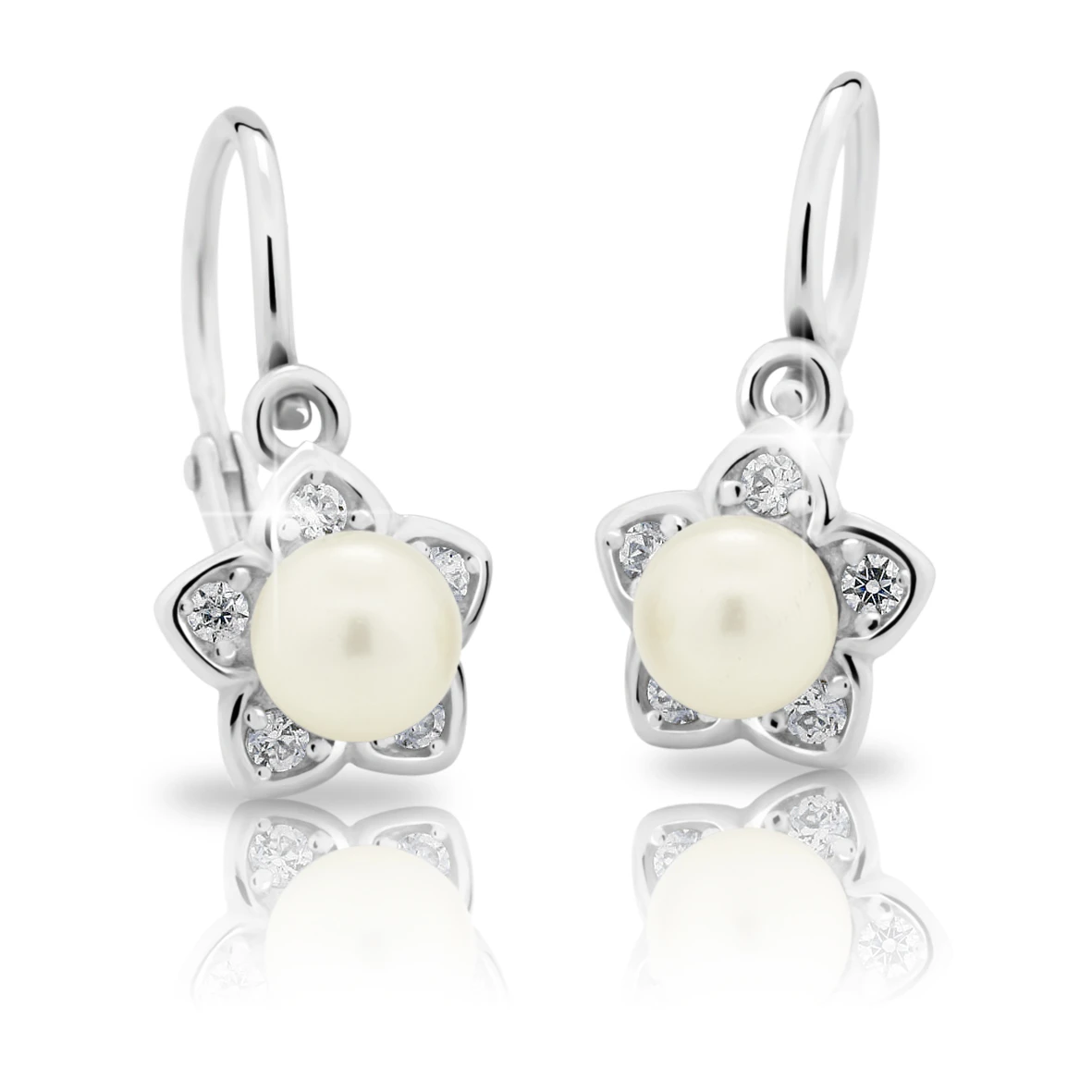 Detské náušnice zo striebra rýdzosti 925/1000. Náušničky sú ozdobené umelými perličkami Swarovski a predstavujú tak jedinečnú ozdobu každej malej princeznej. Detské náušnice s bezpečnostným zapínaním na detskú brizúru. Priemer ozdoby s perličkou 7 mm, výška náušničky 14 mm.