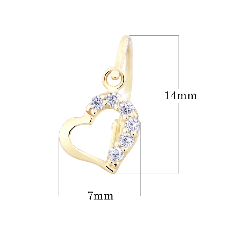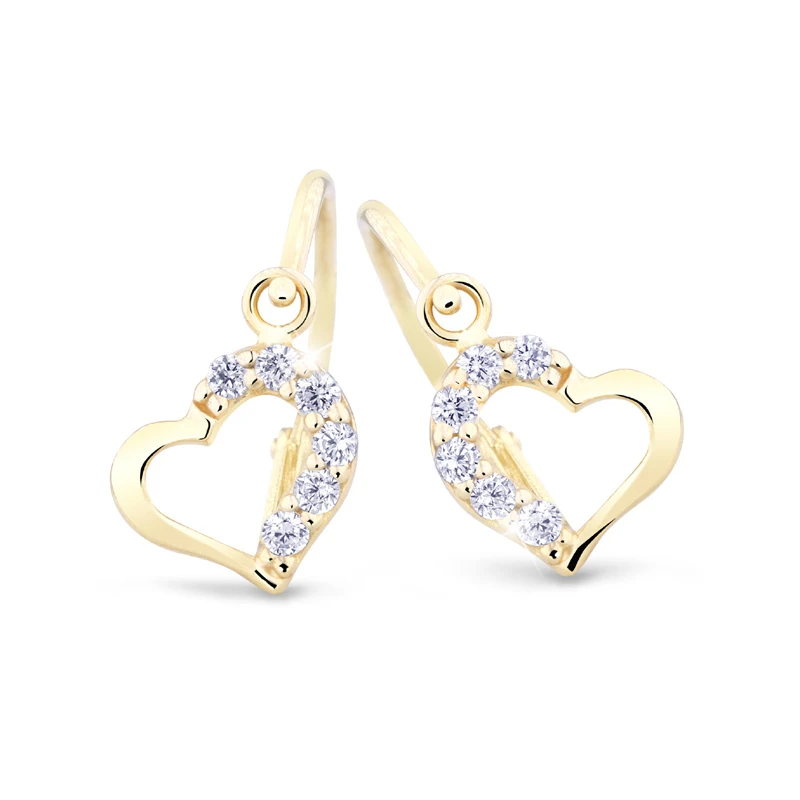 Detské náušnice srdiečka zo žltého zlata 585/1000. Náušničky majú zapínanie na detskú brizúru. Toto zapínanie je skonštruované práve pre detské náušnice a zamedzuje jeho nechcenému roztvoreniu a následnej strate náušničky. Rozmery náušničiek 14mm x 7mm x 7mm nájdete zobrazené na podpornej fotografii. Náušničky sú ozdobené žiarivými zirkónmi.