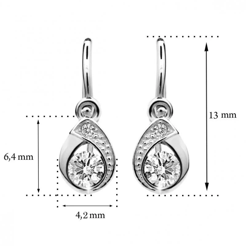 Detské náušnice z bieleho zlata 585/1000. Náušničky majú zapínanie na detskú brizúru. Toto zapínanie je skonštruované práve pre detské náušnice a zamedzuje jeho nechcenému rozovretiu a následnej strate náušničky. Rozmery náušničiek 13mm x 6,4 mm x 4,2 mm nájdete zobrazené na podpornej fotografii. Náušničky sú ozdobené žiarivými zirkónmi.