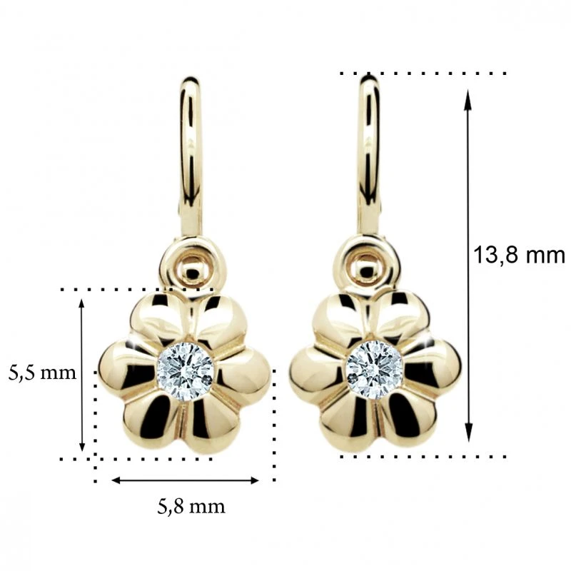 Detské náušnice zo žltého zlata 585/000. Náušnice sú ozdobené kamienkom. Veľkosť náušníc 13,8mm, rozmer ozdoby s kamienkom 5,5x5,8mm. Náušnice majú bezpečnostné detské zapínanie na brizuru, ktoré zamedzuje ľahkému roztvorenie a strate náušničky.