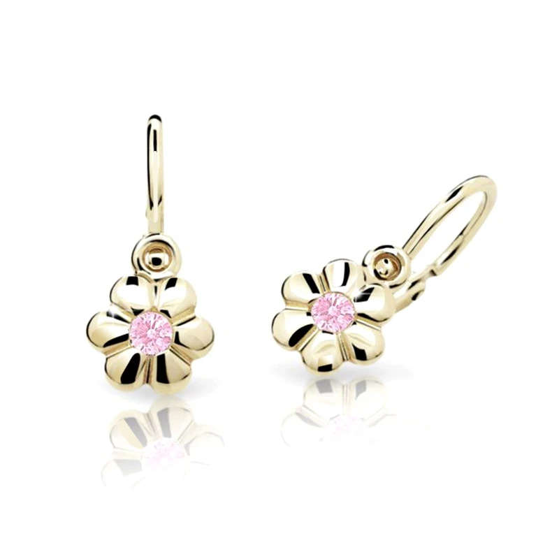 Detské náušnice zo žltého zlata 585/000. Náušnice sú ozdobené kamienkom. Veľkosť náušníc 13,8mm, rozmer ozdoby s kamienkom 5,5x5,8mm. Náušnice majú bezpečnostné detské zapínanie na brizuru, ktoré zamedzuje ľahkému roztvorenie a strate náušničky.