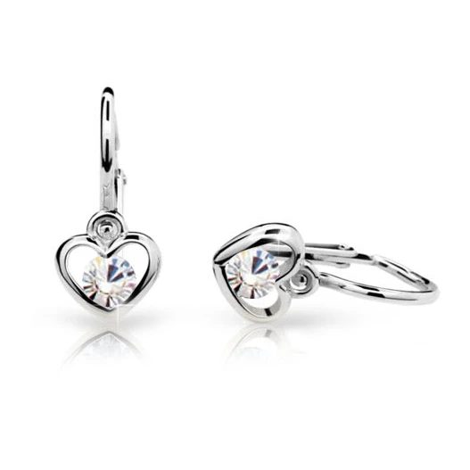 Detské visiace náušnice z bieleho zlata rýdzosti 585/000. Povrch náušníc je leštený. Náušnice je zdobená srdiečkom s kamienkom. Rozmer náušnic 14x6x1,5mm. Náušnice majú bezpečnostné detské zapínanie. Krásne detské náušnice od českého výrobcu Cutie Jewellery.