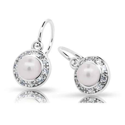 Detské náušnice zo striebra rýdzosti 925/1000. Náušničky sú ozdobené umelými perličkami Swarovski a predstavujú tak jedinečnú ozdobu každej malej princeznej. Detské náušnice s bezpečnostným zapínaním na detskú brizúru. Priemer ozdoby s perličkou 8 mm, výška náušničky 14 mm.