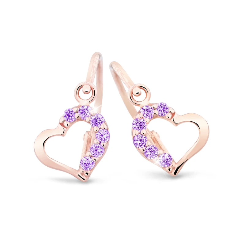 Detské náušnice srdiečka z ružového zlata 585/1000. Náušničky majú zapínanie na detskú brizúru. Toto zapínanie je skonštruované práve pre detské náušnice a zamedzuje jeho nechcenému roztvoreniu a následnej strate náušničky. Rozmery náušničiek 14mm x 7mm x 7mm nájdete zobrazené na podpornej fotografii. Náušničky sú ozdobené žiarivými zirkónmi.