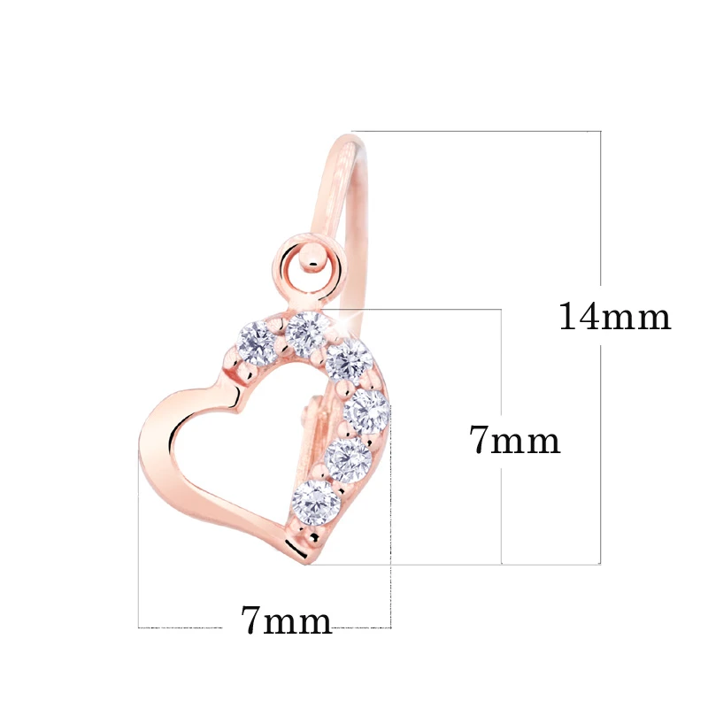 Detské náušnice srdiečka z ružového zlata 585/1000. Náušničky majú zapínanie na detskú brizúru. Toto zapínanie je skonštruované práve pre detské náušnice a zamedzuje jeho nechcenému roztvoreniu a následnej strate náušničky. Rozmery náušničiek 14mm x 7mm x 7mm nájdete zobrazené na podpornej fotografii. Náušničky sú ozdobené žiarivými zirkónmi.