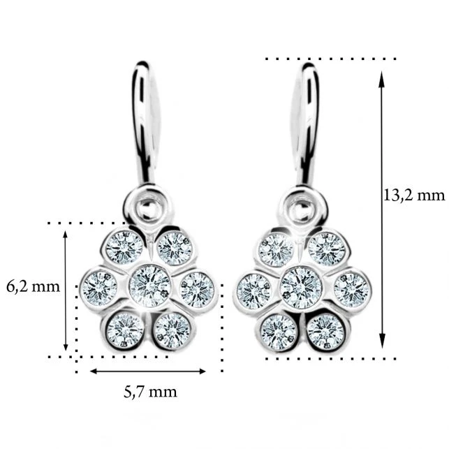 Detské náušnice z bieleho zlata. Náušnice sú navrhnuté a vyrobené s ohľadom na komfortné a bezpečné užívanie pre bábätká od najútlejšieho veku. Zapínanie náušničiek na detskú brizuru zamedzuje ich ľahkému otvoreniu a následnej strate detské náušničky. Kytička má rozmer 6,2 × 5,7 mm, celková "výška" náušničky 13,2 mm.