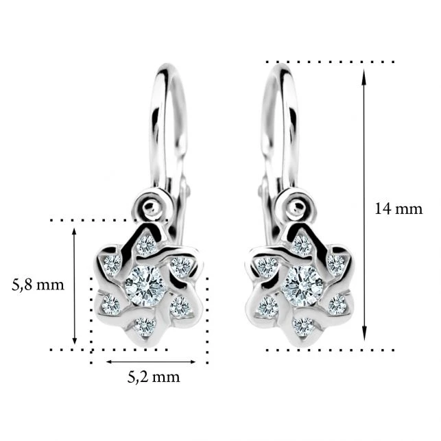 Detské náušnice vyrobené zo 14ti karátového zlata so zirkónmi. Náušnice sú navrhnuté a vyrobené s ohľadom na komfortné a bezpečné užívanie pre bábätká od najútlejšieho veku. Zapínanie náušničiek na detskú brizuru zamedzuje ich ľahkému otvoreniu a následnej strate detské náušničky. Kytička sa zirkónmi má rozmer 5,8 × 5,2 mm, celková "výška" náušničky 14 mm. Rozmery náušničiek nájdete zobrazené na prehľadnom podpornom obrázku.
