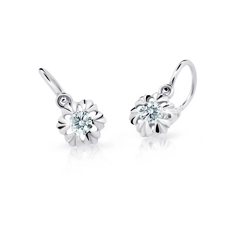 Detské náušnice z bieleho zlata 585/1000. Náušničky majú zapínanie na detskú brizúru. Toto zapínanie je skonštruované práve pre detské náušnice a zamedzuje jeho nechcenému roztvoreniu a následnej strate náušničky. Rozmery náušničiek 14mm x 6,2mm x 7,6mm nájdete zobrazené na podpornej fotografii. Náušničky sú ozdobené žiarivými zirkónmi.