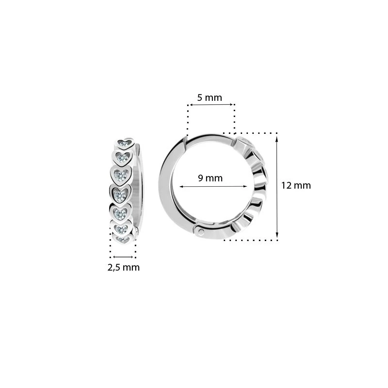 Detské náušnice z bieleho zlata v tvare krúžku. Praktický kruhový tvar detských náušničiek je zárukou ich pohodlného užívania ako pre bábätká tak pre väčšie parádnice školou povinné. Vonkajší priemer náušničiek 12 mm, vnútorný priemer 9 mm. Krúžky sú široké 2,5 mm. Driek zapínanie je dlhý 5 mm. Uvedené rozmery detských náušníc nájdete na podpornom obrázku.