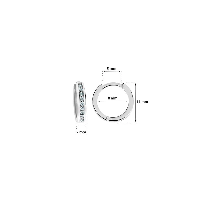 Detské náušnice krúžky z bieleho zlata. Praktický kruhový tvar detských náušničiek je zárukou ich pohodlného užívania. Vonkajší priemer náušničiek 11 mm, vnútorný priemer 8 mm. Krúžky sú široké 2,0 mm. Driek zapínanie je dlhý 5 mm.