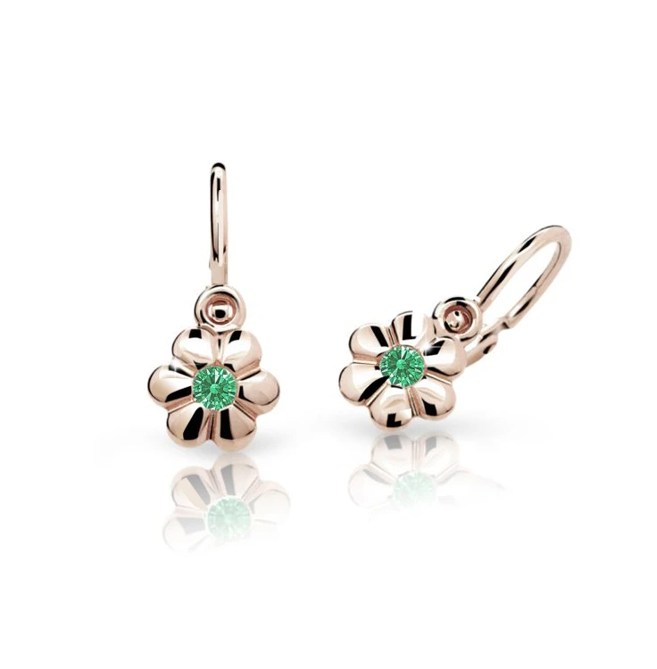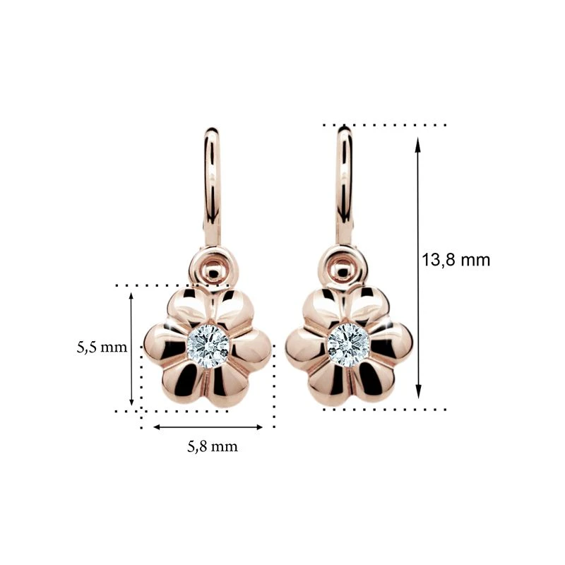 Detské náušnice z ružového zlata 585/000. Náušnice sú ozdobené kamienkom. Veľkosť náušníc 13,8mm, rozmer ozdoby s kamienkom 5,5x5,8mm. Náušnice majú bezpečnostné detské zapínanie na brizuru, ktoré zamedzuje ľahkému roztvorenie a strate náušničky.