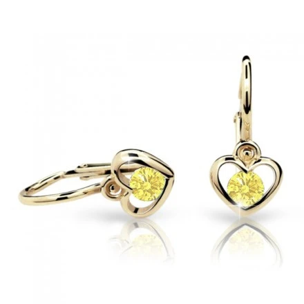 Detské náušnice zo žltého zlata rýdzosti 585/000. Povrch náušníc je leštený. Náušnice je zdobená srdiečkom s kamienkom. Priemer náušníc: 14mm, rozmer ozdoby 6x1,5 mm. Náušnice majú bezpečnostné detské zapínanie. Krásne detské náušnice od českého výrobcu Cutie Jewellery.