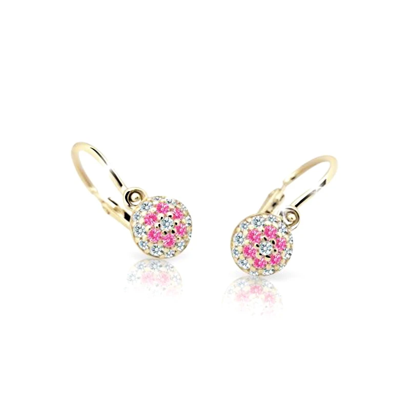 Detské náušničky zhotovené zo žltého 14 karátového zlata . Náušnice sú navrhnuté a vyrobené s ohľadom na komfortné a bezpečné užívanie pre deti už od dojčenského veku. Zapínanie náušničiek na detskú brizuru zamedzuje ich ľahkému otvoreniu a následnej strate detské náušničky. Ozdoba so zirkónmi má rozmer 5,5 × 5,5 mm, celková "výška" náušničky 13,6 mm. Rozmery náušničiek nájdete na prehľadnej podporné fotografiu.
