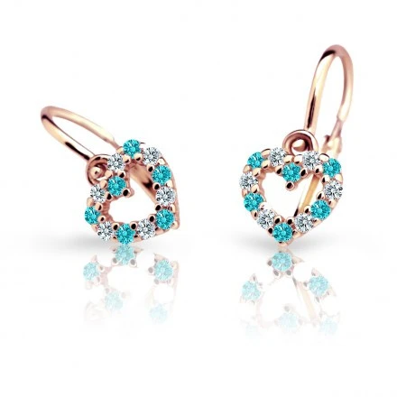 Detské náušnice srdiečka vyrobené zo 14 karátového zlata. Náušnice sú navrhnuté a vyrobené s ohľadom na komfortné a bezpečné užívanie pre bábätká od najútlejšieho veku. Zapínanie náušničiek na detskú brizuru zamedzuje ich ľahkému otvoreniu a následnej strate detské náušničky. Srdiečko so zirkónom má rozmer 6,5 × 6,0 mm, celková "výška" náušničky 14,2 mm.
