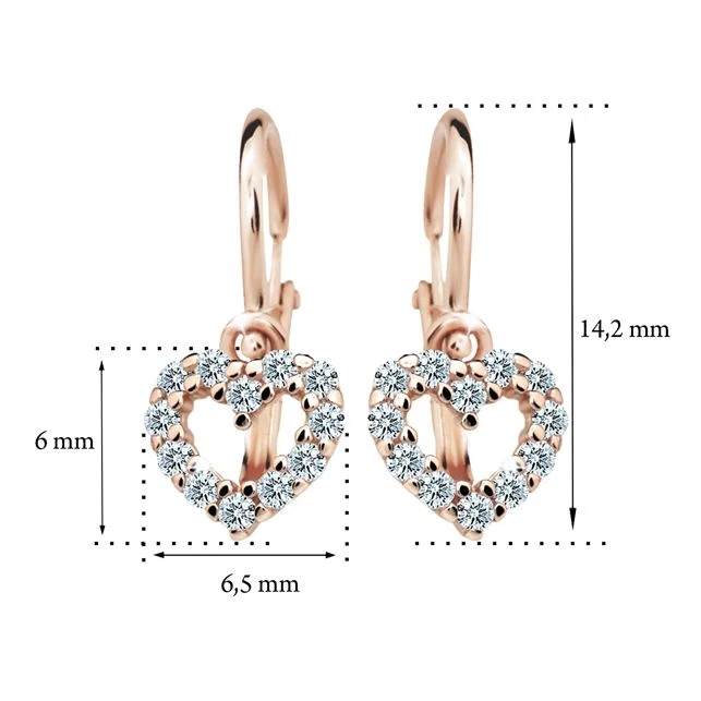 Detské náušnice srdiečka vyrobené zo 14 karátového zlata. Náušnice sú navrhnuté a vyrobené s ohľadom na komfortné a bezpečné užívanie pre bábätká od najútlejšieho veku. Zapínanie náušničiek na detskú brizuru zamedzuje ich ľahkému otvoreniu a následnej strate detské náušničky. Srdiečko so zirkónom má rozmer 6,5 × 6,0 mm, celková "výška" náušničky 14,2 mm.