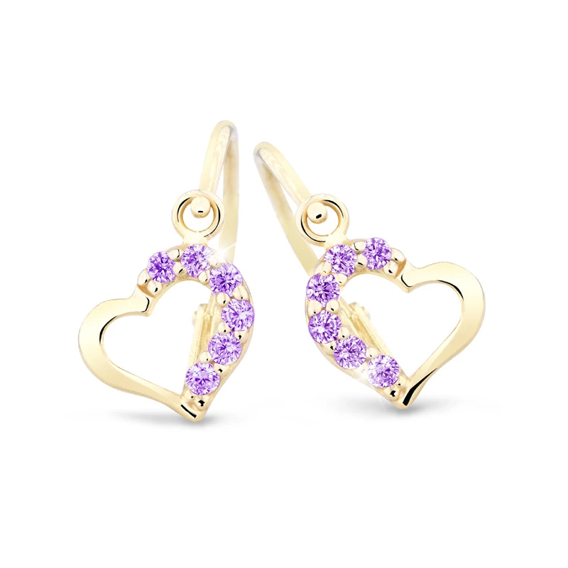 Detské náušnice srdiečka zo žltého zlata 585/1000. Náušničky majú zapínanie na detskú brizúru. Toto zapínanie je skonštruované práve pre detské náušnice a zamedzuje jeho nechcenému roztvoreniu a následnej strate náušničky. Rozmery náušničiek 14mm x 7mm x 7mm nájdete zobrazené na podpornej fotografii. Náušničky sú ozdobené žiarivými zirkónmi.