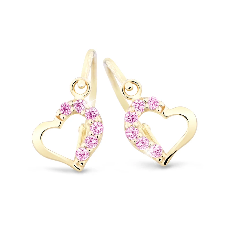 Detské náušnice srdiečka zo žltého zlata 585/1000. Náušničky majú zapínanie na detskú brizúru. Toto zapínanie je skonštruované práve pre detské náušnice a zamedzuje jeho nechcenému roztvoreniu a následnej strate náušničky. Rozmery náušničiek 14mm x 7mm x 7mm nájdete zobrazené na podpornej fotografii. Náušničky sú ozdobené žiarivými zirkónmi.