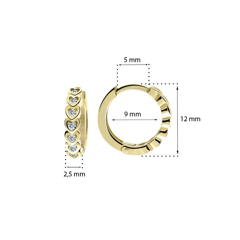Detské náušnice zo žltého zlata 585/000 v tvare krúžku. Praktický kruhový tvar detských náušničiek je zárukou ich pohodlného užívania ako pre bábätká tak pre väčšie parádnice školou povinné. Vonkajší priemer náušničiek 12 mm, vnútorný priemer 19 mm. Krúžky sú široké 2,5 mm. Driek zapínanie je dlhý 5 mm. Rozmery týchto zlatých detských náušníc nájdete prehľadne zobrazené na podporné fotografiu.