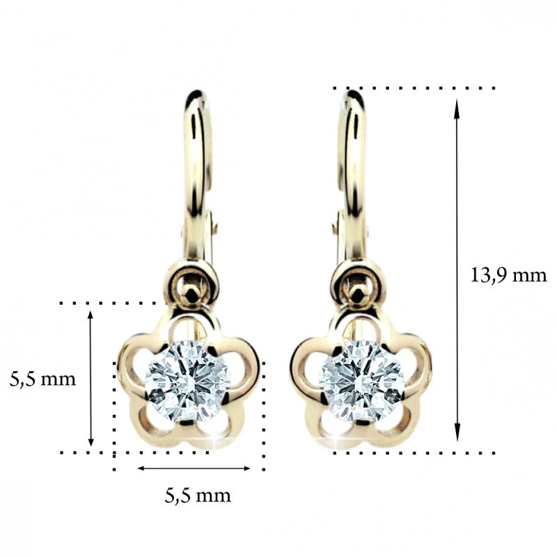 Detské náušnice kvietky vyrobené zo 14.ti karátového zlata. Náušnice sú navrhnuté a vyrobené s ohľadom na komfortné a bezpečné užívanie pre bábätká od najútlejšieho veku. Zapínanie náušničiek na detskú brizuru zamedzuje ich ľahkému otvoreniu a následnej strate detské náušničky. Kytička má rozmer 5,5 × 5,5 mm, celková "výška" náušničky 13,9 mm.
