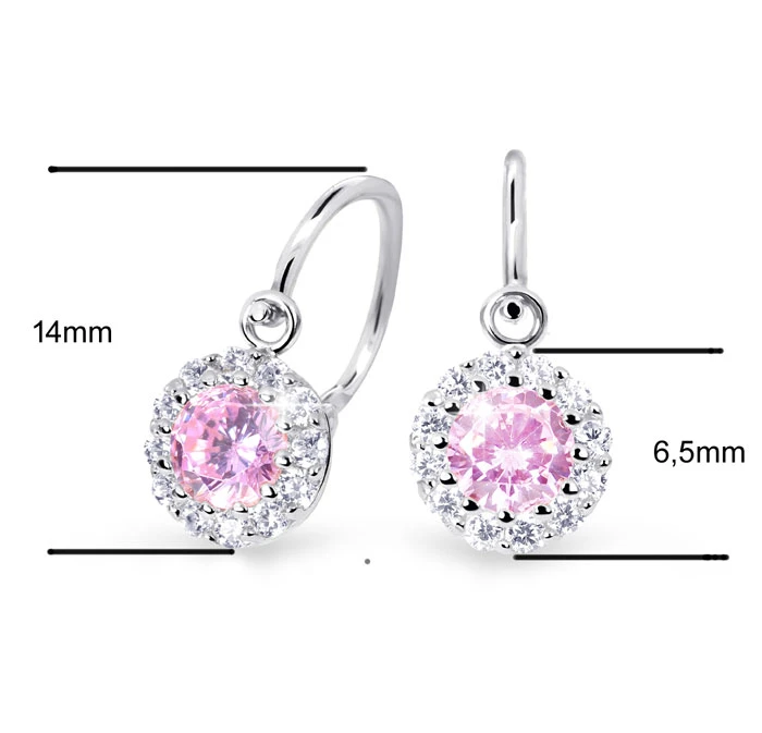 Zlaté detské náušnice z bieleho zlata rýdzosti 585/000. Detské náušničky ozdobené žiarivými zirkónmi. Náušnice pre bábätko so zapínaním na bezpečnosťou detskú brizuru. Priemer ozdobné časti náušníc 6,5 mm, celková výška náušničiek 14 mm.