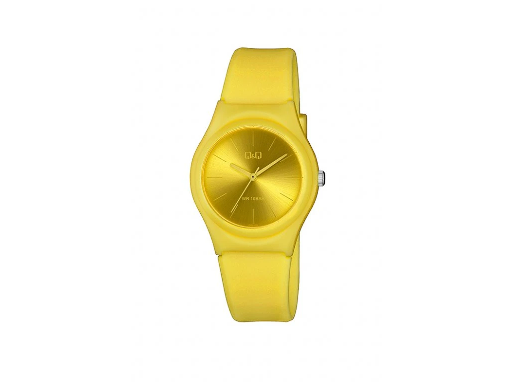Náramkové hodinky pre ženy a dievčatá. Hodinky majú plastové puzdro aj remienok. Puzdro hodiniek má priemer 34mm, hrúbka puzdra 9,0mm. Žltý ciferník s indexmi má priemer 26mm. Hodinky sú vybavené hodinovou, minútovou a sekundovou rúčkou. Plastový remienok so zapínaním na jednoduchú sponu je široký 16mm. Hodinky sú vodotesné na úrovni 10ATM. Hodinky poháňa spoľahlivý batériový strojček. Hodinky sú dodávané vrátane darčekovej krabičky.