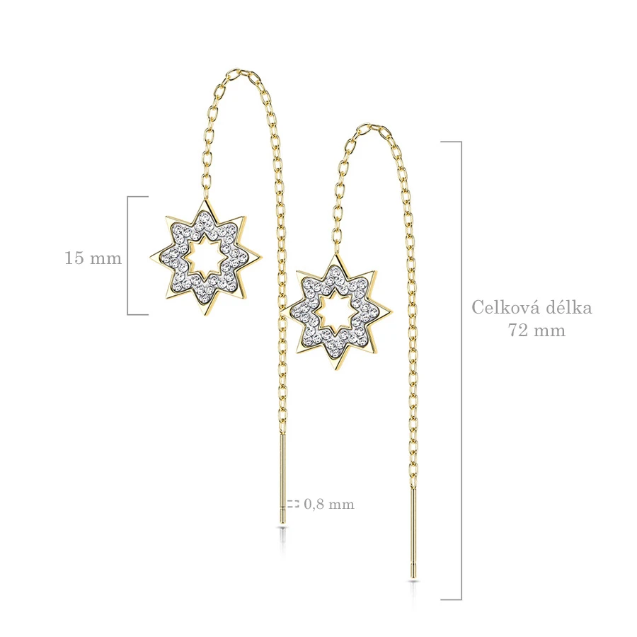 Visiace náušnice z chirurgickej ocele s hviezdami. Hviezdy sú ozdobené zirkónmi. Priemer hviezd 15mm, celková dĺžka náušnice s retiazkou 72mm. Rozmery náušníc nájdete zobrazené na podpornej fotografii.
