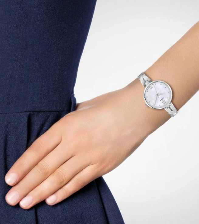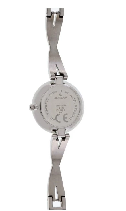 Dámske hodinky Dugena s oceľovým náramkom. Hodinky sú vyrobené z chirurgickej ocele, sklíčko hodiniek je minerálne. Perleťový ciferník s rímskymi číslami a indexy. Hodinky sú vybavené, hodinovou, minútovou a sekundovou ručičkou. Rozmer púzdra 30x8mm. Chod hodiniek zaisťuje spoľahlivý batériový strojček. Hodinky sú vodotesné na úrovni 3 ATM. Na všetky dámske hodinky Dugena platí záruka v dĺžke 36 mesiacov. Hodinky sú dodávané v darčekovej krabičke s logom.