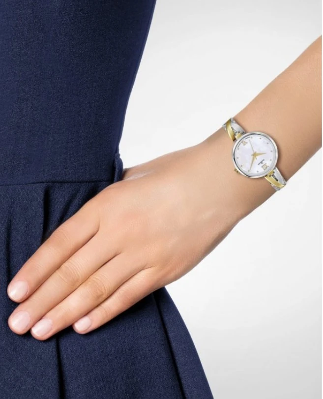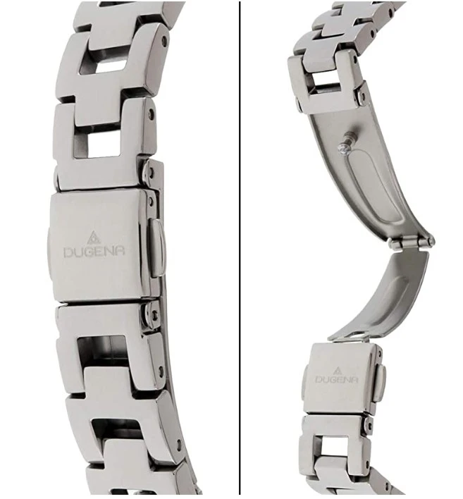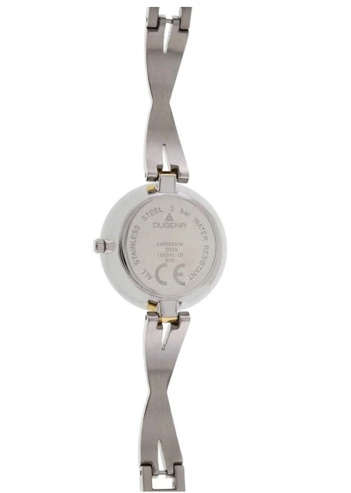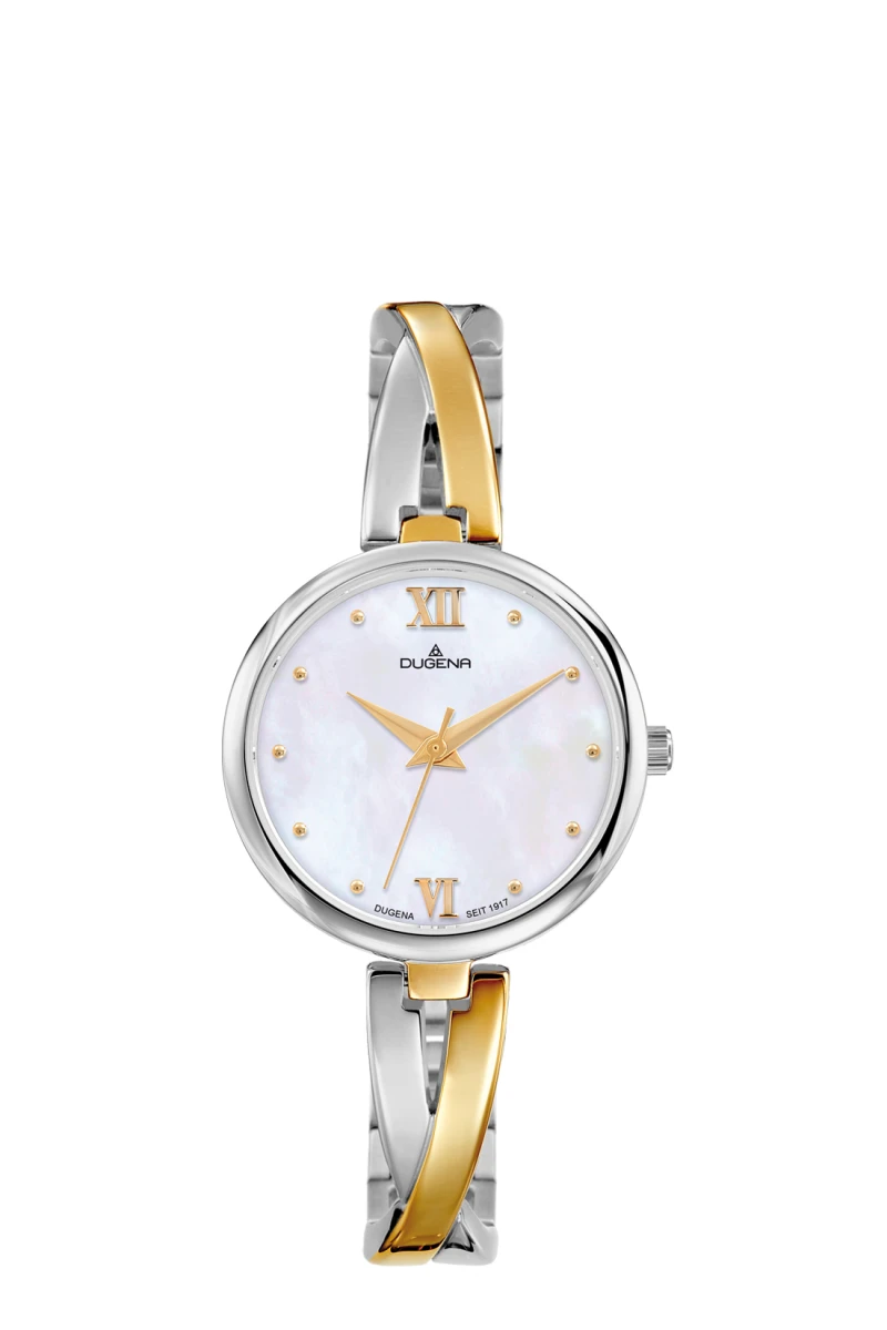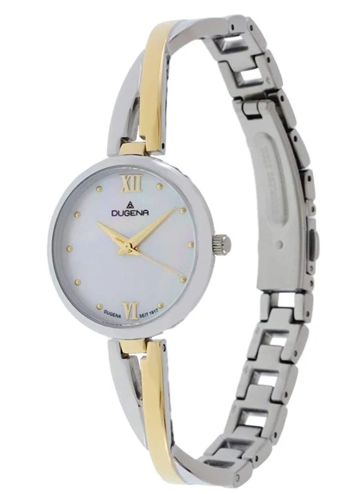Dámske hodinky Dugena s oceľovým náramkom. Hodinky sú vyrobené z chirurgickej ocele, sklíčko hodiniek je minerálne. Perleťový ciferník s rímskymi číslami a indexy. Hodinky sú vybavené, hodinovou, minútovou a sekundovou ručičkou. Rozmer púzdra 30x8mm. Zlaté prvky hodiniek sú pozlátené žltým zlatom technológií IP. Chod hodiniek zaisťuje spoľahlivý batériový strojček. Hodinky sú vodotesné na úrovni 3 ATM. Na všetky dámske hodinky Dugena platí záruka v dĺžke 36 mesiacov. Hodinky sú dodávané v darčekovej krabičke s logom.