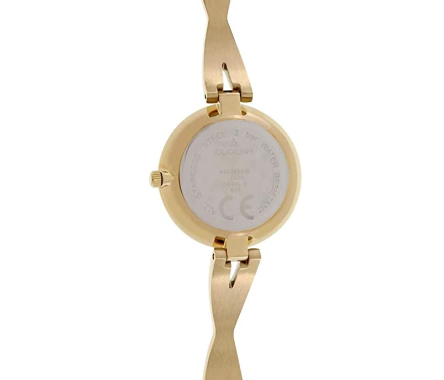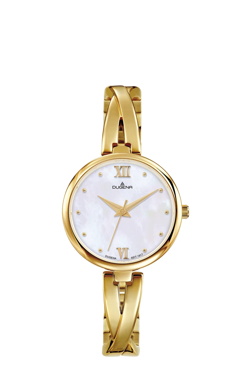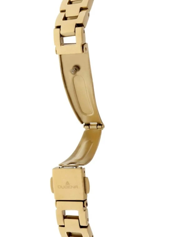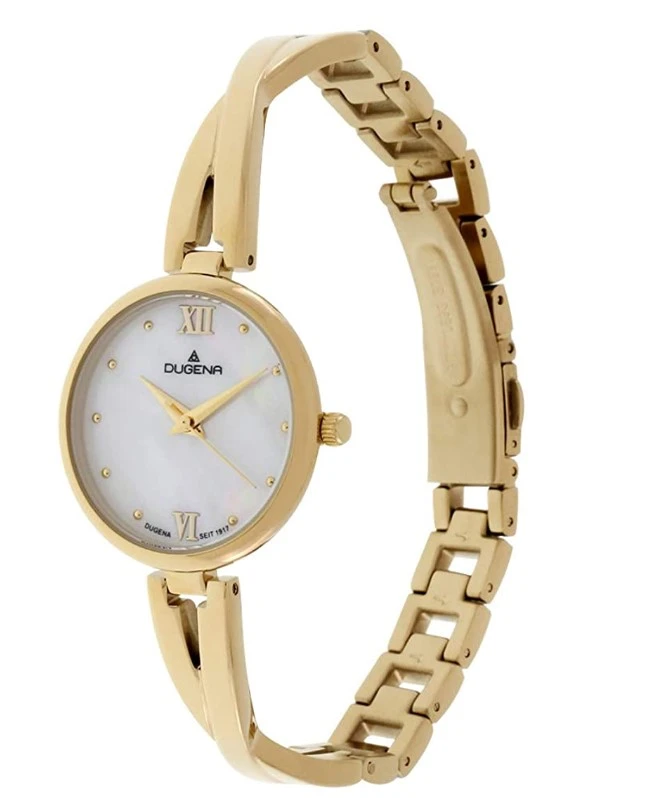 Dámske hodinky Dugena s oceľovým náramkom. Hodinky sú vyrobené z chirurgickej ocele, sklíčko hodiniek je minerálne. Perleťový ciferník s rímskymi číslami a indexy. Hodinky sú vybavené, hodinovou, minútovou a sekundovou ručičkou. Rozmer púzdra 30x8mm. Hodinky sú pozlátené žltým zlatom technológií IP. Chod hodiniek zaisťuje spoľahlivý batériový strojček. Hodinky sú vodotesné na úrovni 3 ATM. Na všetky dámske hodinky Dugena platí záruka v dĺžke 36 mesiacov. Hodinky sú dodávané v darčekovej krabičke s logom.