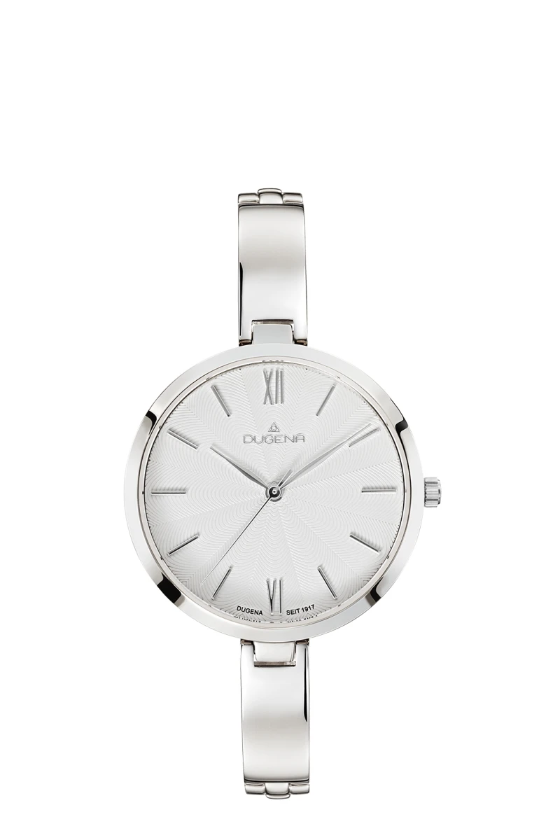 Dámske hodinky Dugena s oceľovým náramkom. Hodinky sú vyrobené z chirurgickej ocele, sklíčko hodiniek je minerálne. Okrúhly biely ciferník s rímskymi číslami a indexy. Hodinky sú vybavené, hodinovou, minútovou a sekundovou ručičkou. Puzdro hodiniek má priemer 34 mm. Chod hodiniek zaisťuje spoľahlivý batériový strojček. Hodinky sú vodotesné na úrovni 5 ATM. Na všetky dámske hodinky Dugena je poskytovaná záruka v dĺžke 36 mesiacov. Hodinky sú dodávané v darčekovej krabičke s logom.