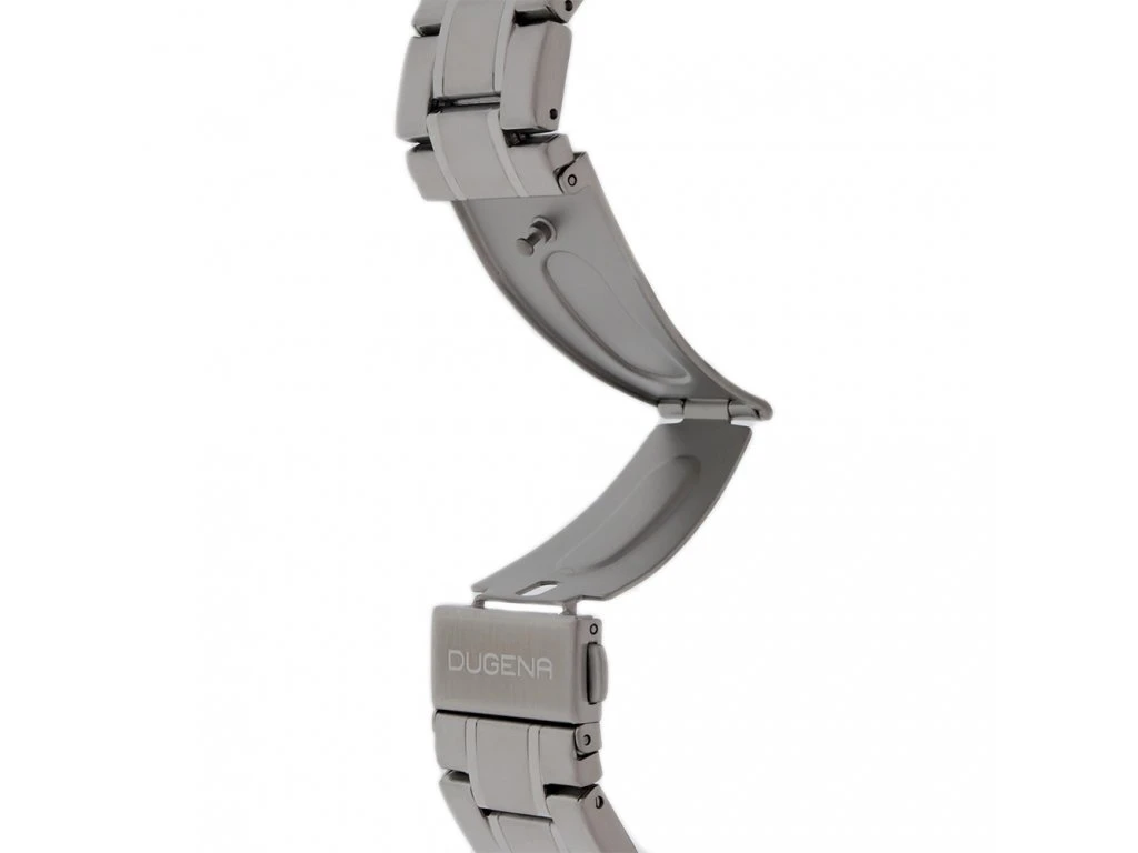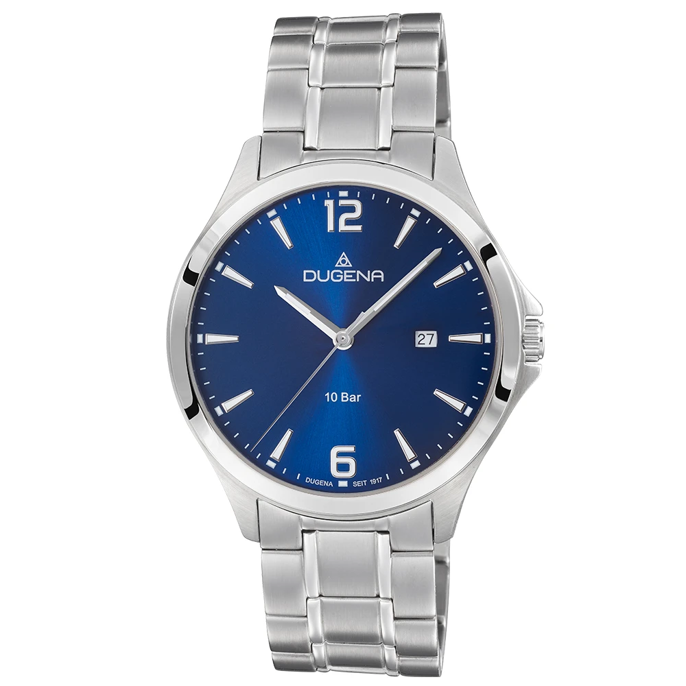 Pánske náramkové hodinky Dugena s oceľovým ťahom so zapínaním na skladaciu sponu, sklíčko hodiniek je minerálne. Okrúhly modrý ciferník s indexy. Hodinky sú vybavené datumkou, hodinovou, minútovou a sekundovou rúčkou. Priemer puzdra hodiniek 42mm, výška puzdra 9mm. Puzdro hodiniek je vyrobené z chirurgickej ocele. Chod hodiniek zaisťuje spoľahlivý batériový strojček. Hodinky sú vodotesné na úrovni 10 ATM. Na všetky hodinky Dugena platí záruka v dĺžke 36 mesiacov. Hodinky sú dodávané v darčekovej krabičke s logom.