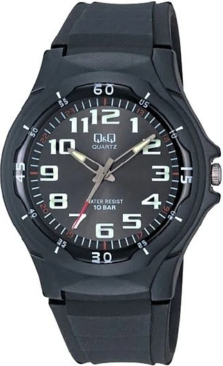 Hodinky Q + Q. Hodinky majú čierny ciferník s číselníkom, hodinovou, minútovou a sekundovou rúčku. Ciferník má priemer 28mm. Plastové puzdro má rozmer 44 * 40mm. Plastový pásik je široký 18mm. Strojček poháňajúci hodinky je batériový značky Miyota. K hodinkám obdržíte plastovú krabičku. Hodinky sú vodeodolné do 10ATM.
